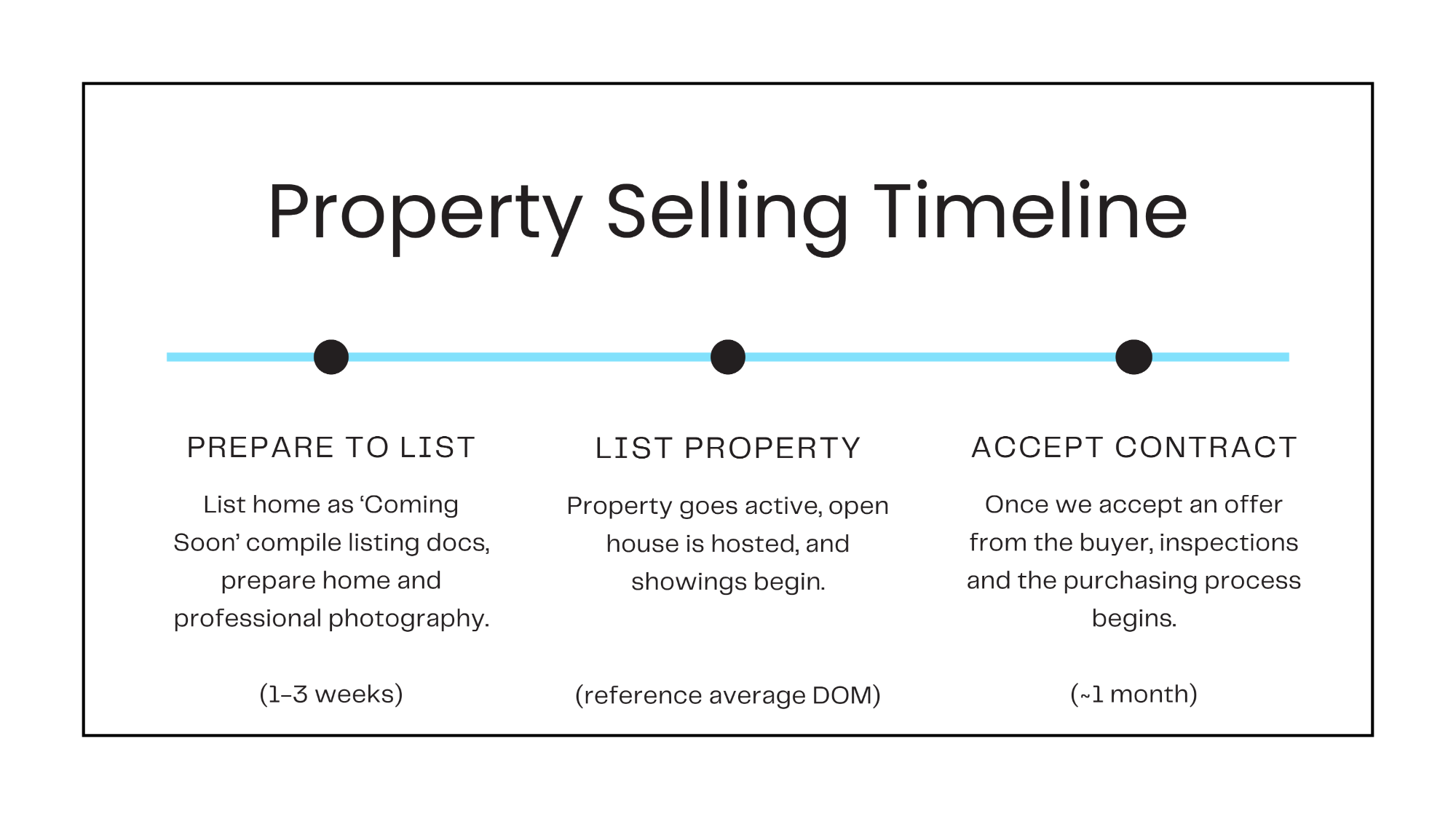 - The average days on market does not include the time to prepare a home to sell (7-30 days) or the time it takes to close once the contract has been accepted (an average of 30 days).