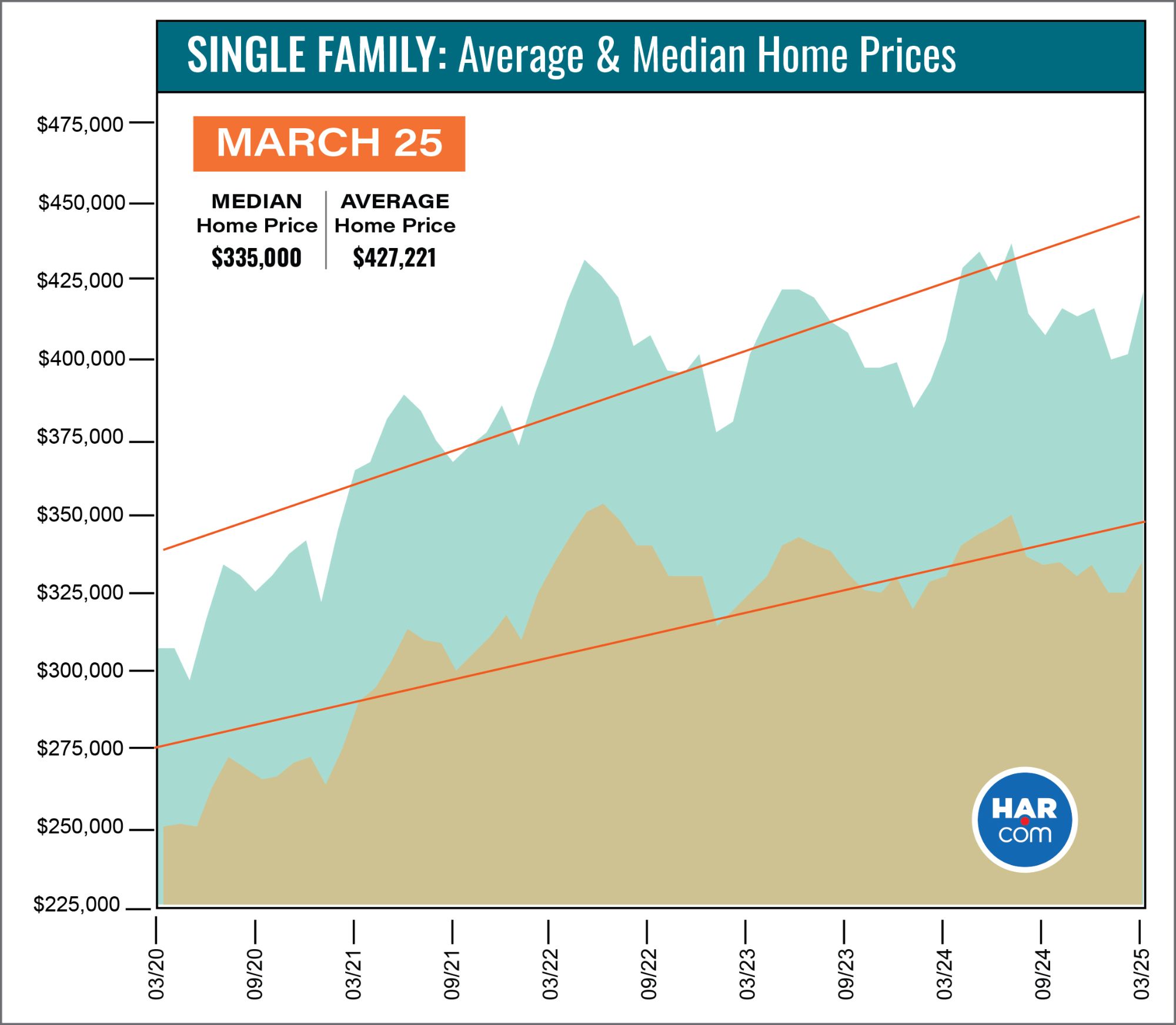 Based on the most recent HAR Housing report, average and median home prices in Houston are on an upward trend (see graph below):